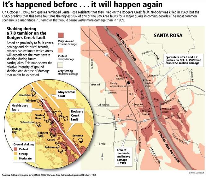 The Rodgers Creek fault bisects Santa Rosa, and passes under or very near to all major hospitals in the city. A major quake on this fault is likely to devastate downtown and incapacitate most city and county facilities.